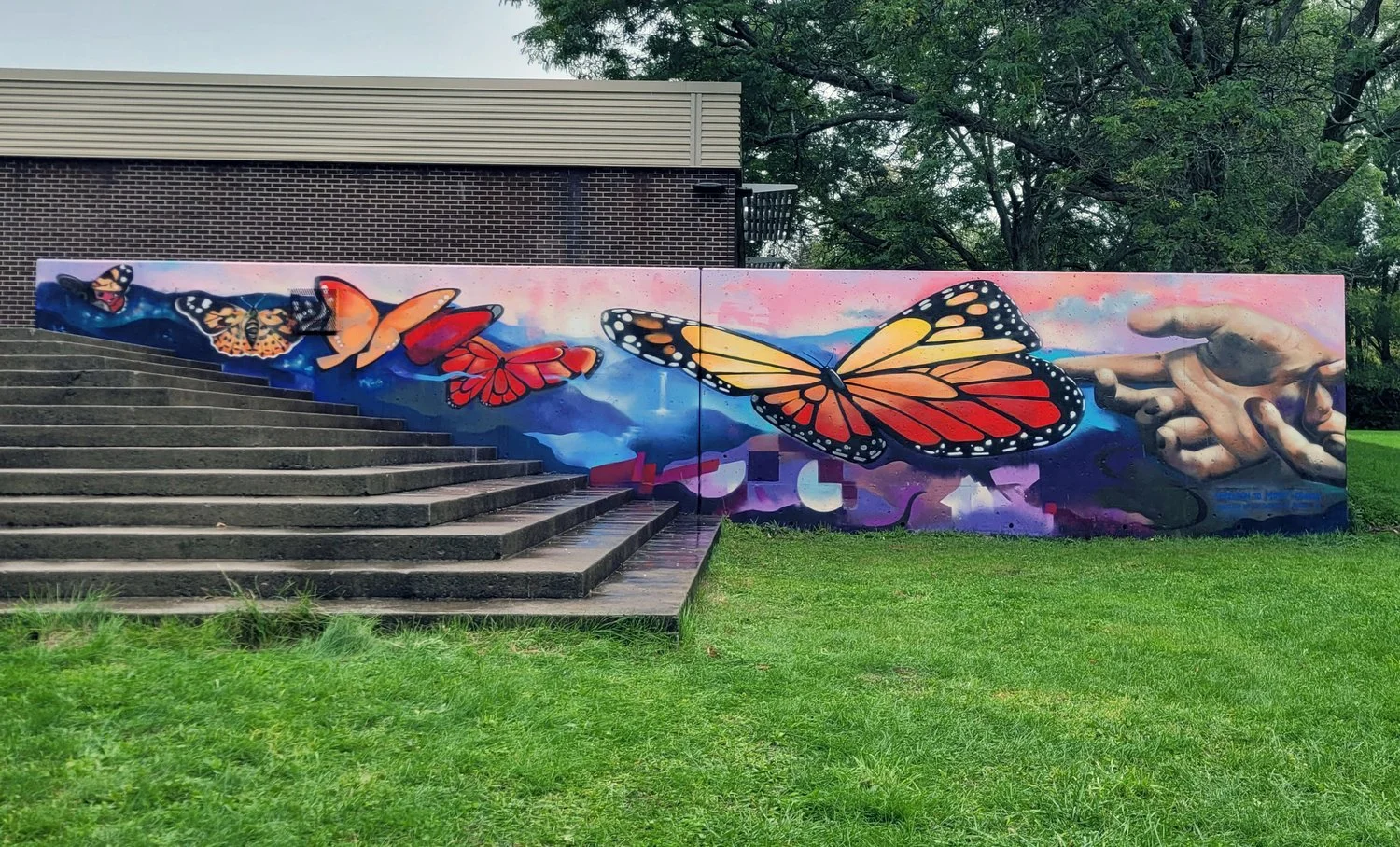 This piece was created for SW Community Gardens. It depicts one hand passing an echinacea flower to the next -- in the bed of flora. Carpenter bees, which live in the gardens, are also represented in the mural. This mural project included a paint-by-the-numbers community painting session.